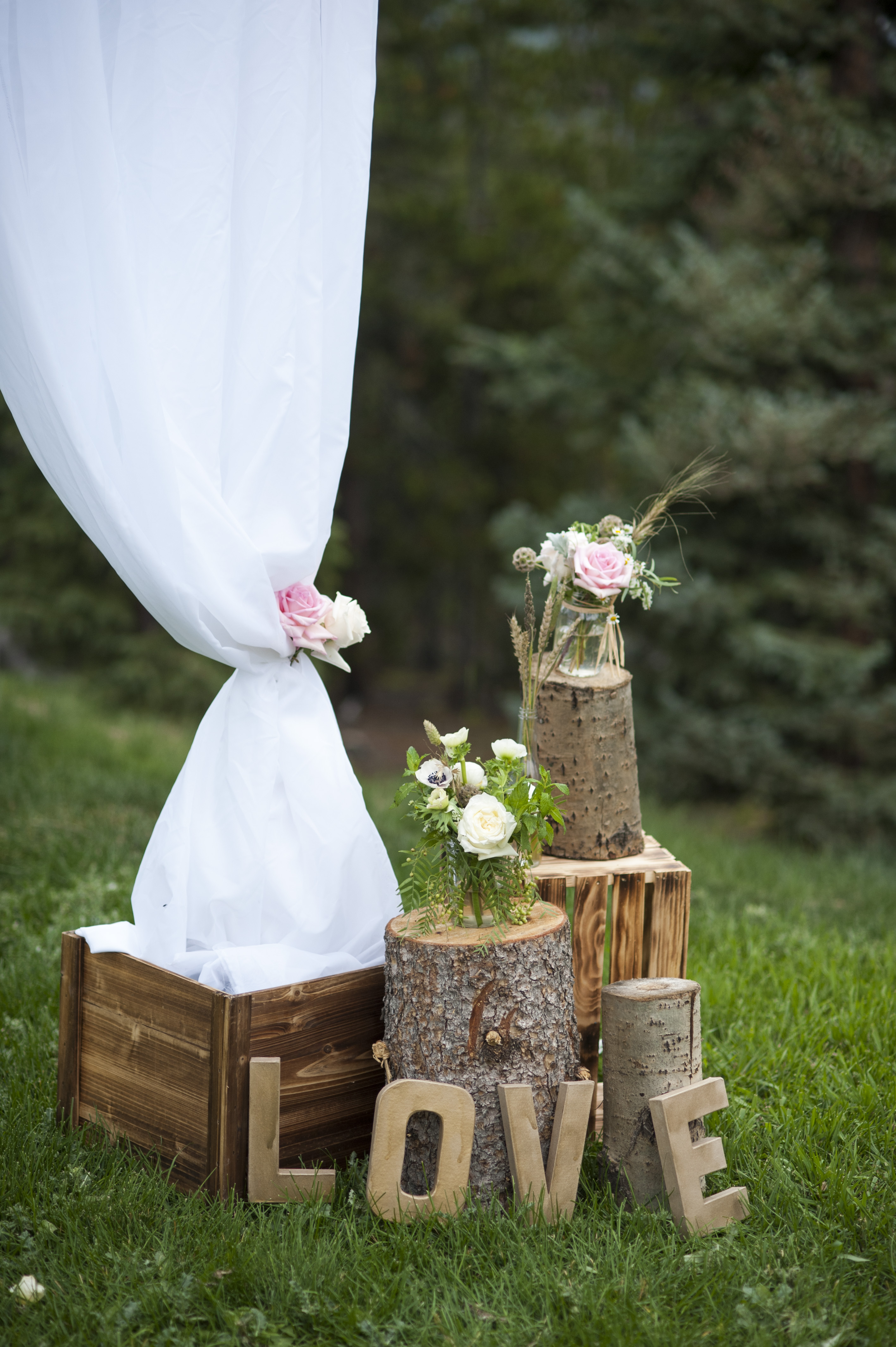 We had a friend, who already had a permit to get firewood, get us some extra wood stumps that we could use for our aisle decor. This was a simple project that didn’t require any work from us because our friend did all the wood-collecting and chainsawing, but it was a nail-biting experience for months wondering if the wood stumps would dry and crack too much before the wedding day. It was well worth the wait to see them on our wedding day, fitting in so perfectly with our woodsy theme.