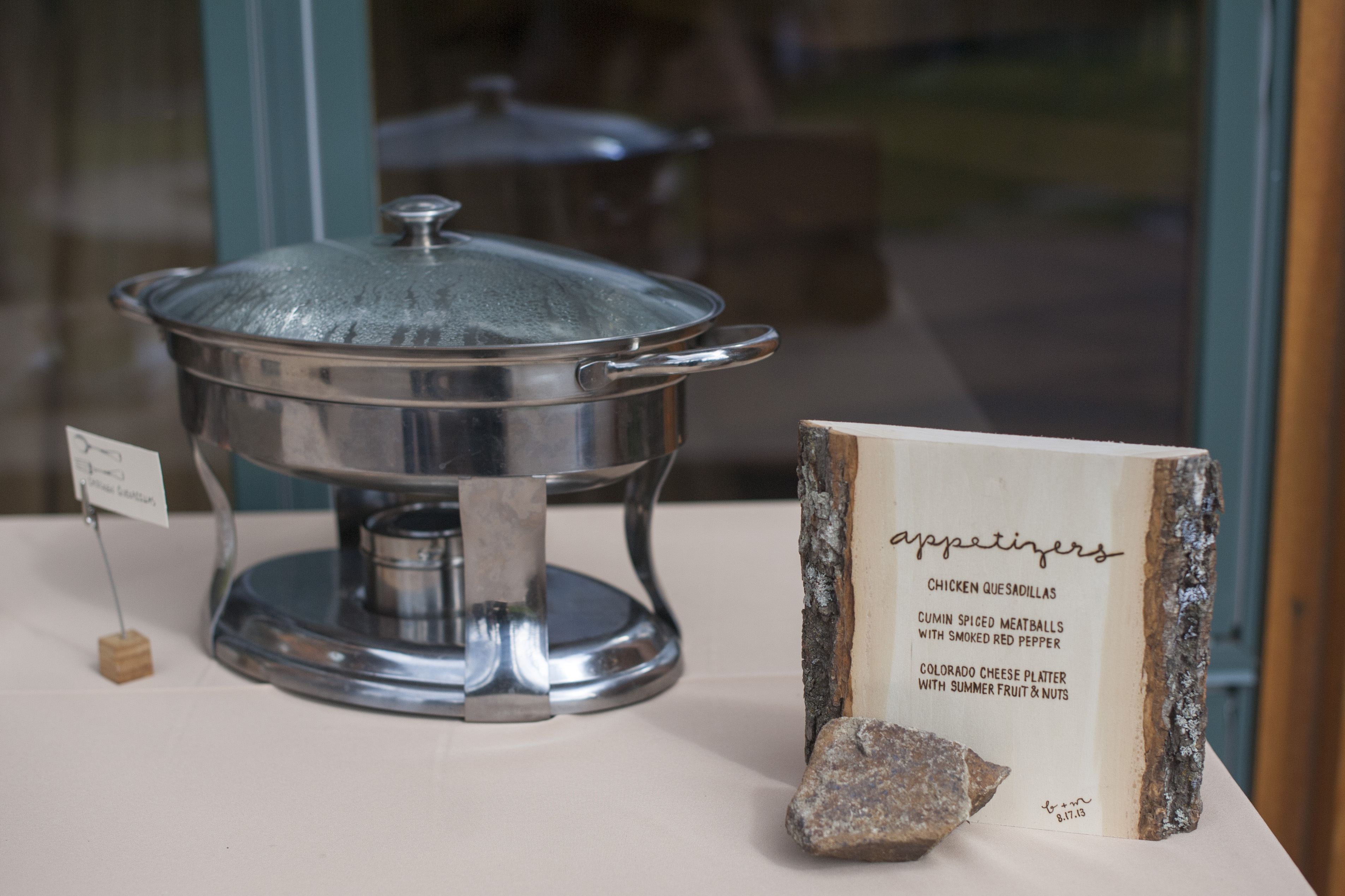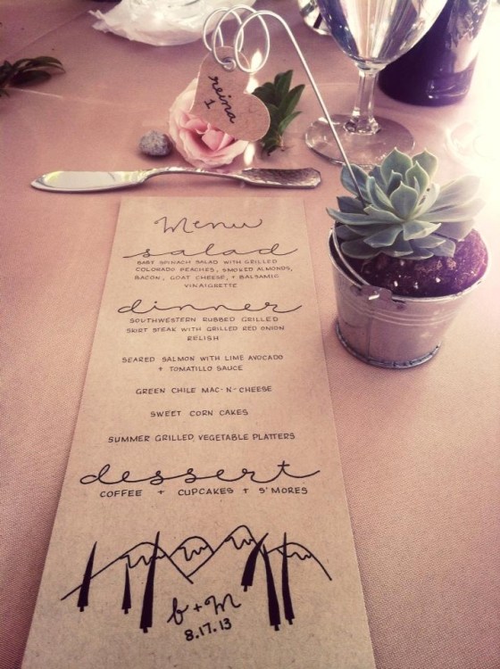 Similar to the welcome bags, the menus became a great opportunity to re-use the mountain design featured on our invites. I created many versions of the calligraphy and design placement on the menus and it was several weeks before I had finally decided on the perfect menu… but not before creating 60 menus that I thought I was happy with and ended up scraping. Needless to say, by the end of this project, I had our menus memorized by heart.