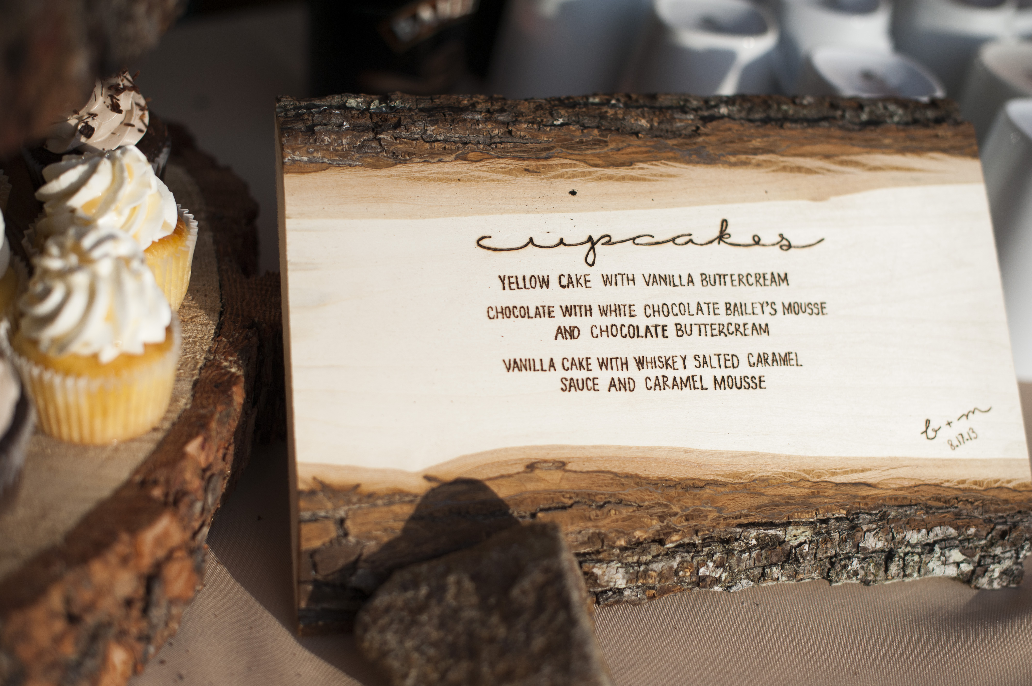It’s no surprise our cupcake tier was also made of wood slices! When I priced out wood-slice cupcake tiers on Etsy, my heart dropped and I didn’t think we would get the cute cupcake tier I had imagined. Luckily, the friend who got us our wood stumps for the aisle decor, also volunteered to cut some thick slices out of bigger logs so we could make our cupcake tier.