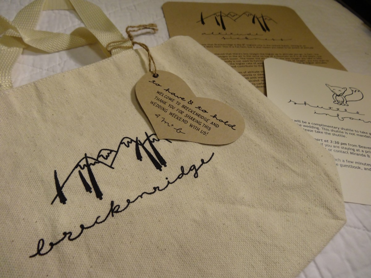 Breckenridge Welcome Bags Published October 23, 2013 at 4896 × 3672 in Wedding Recaps: A real fox for our woodland wedding! ← Previous Next → Our Breckenridge Welcome Bags… of course, they were filled with goodies for the guests