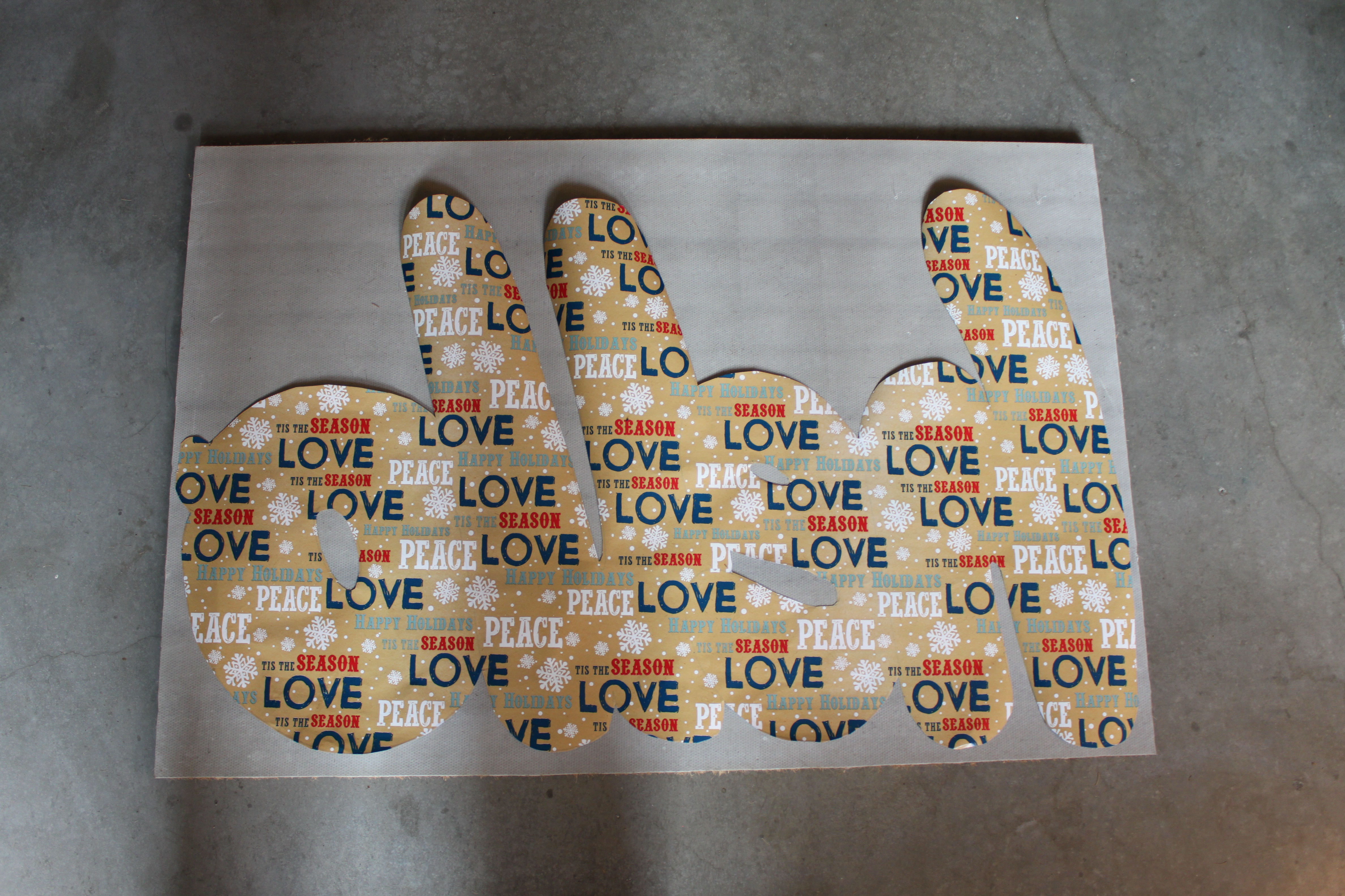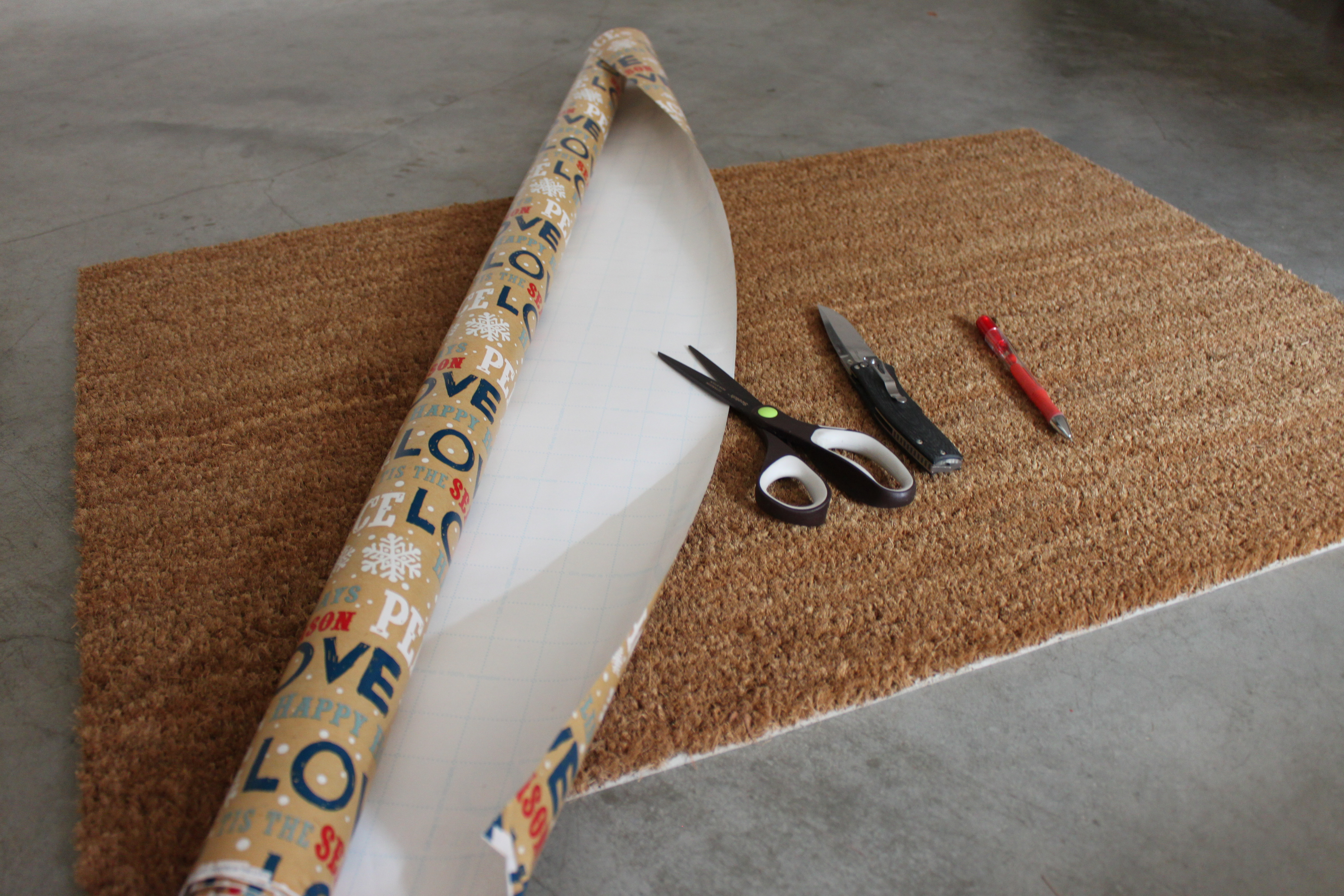 The first step is to cut a piece of your wrapping paper to the exact size of the mat, that way when you go to draw your words you will already know they fit to the exact dimensions of your doormat.