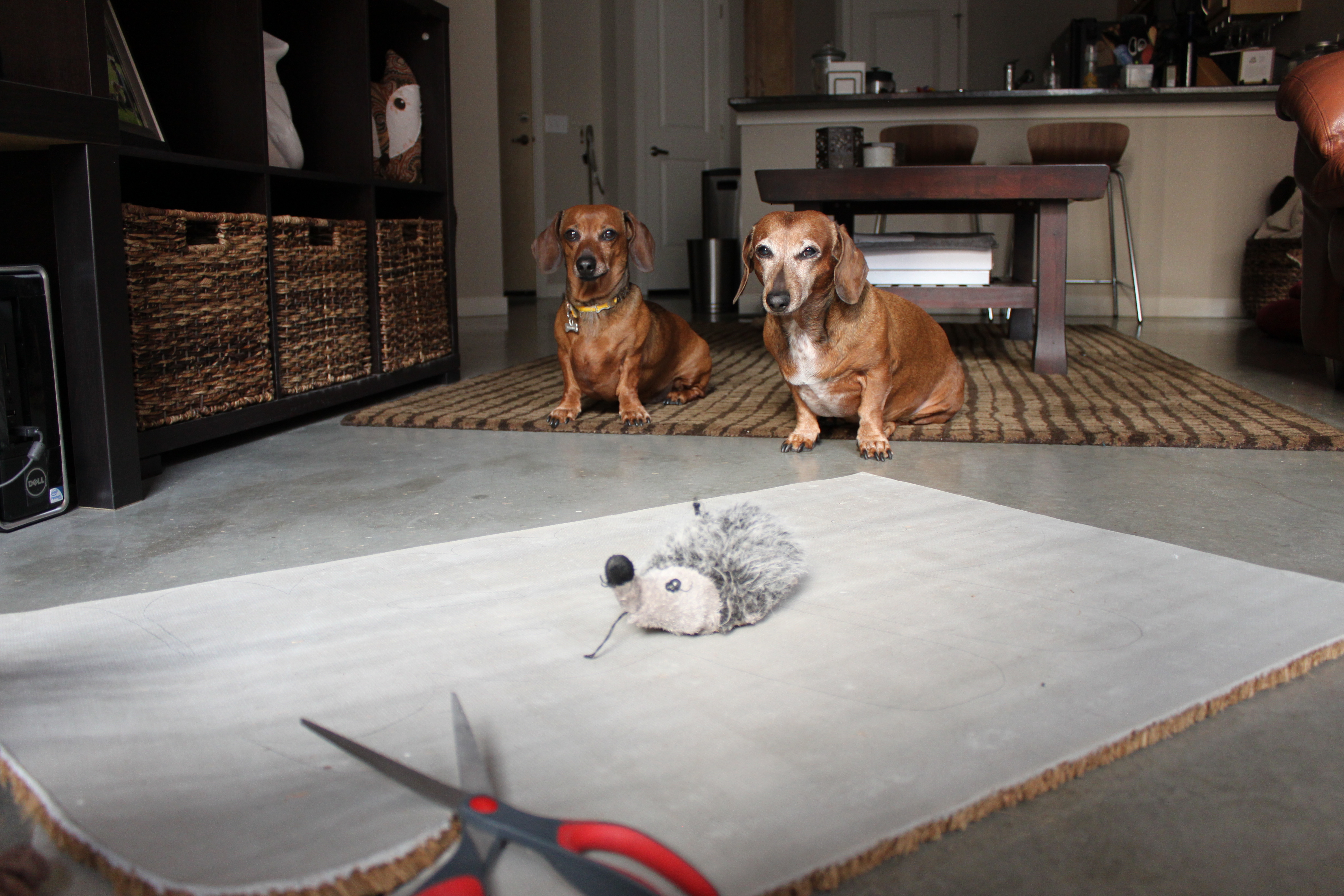 If you have two pathetic-looking, attention-hogging dachshunds like me, you will need to cut and play fetch at the same time. Trying to cut the doormat can be very exhausting and tough on your hands. You will have to take a lot of short breaks to let your hands rest. Also, frequently check your scissors for trapped fibers from the door mat that might prevent your scissors from cutting easily. I didn’t realize why I was having such a hard time cutting (me, a wimp? naw!!) until I realized halfway through my project how much crud was stuck in the hinge of the scissors (see, it wasn’t just me and my wimpy arms!).