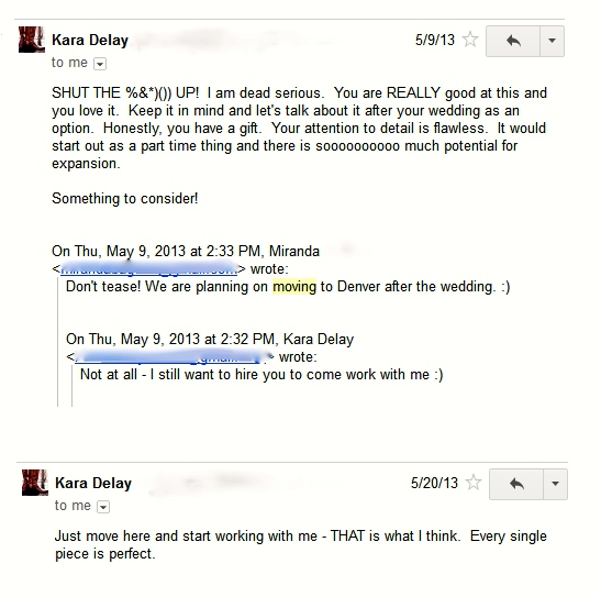 But after our move to Denver, I decided that even though this could have been a dream job doing what I loved, I wouldn’t always love the greedy wedding industry work environment or the bridezillas people that I worked with. And I wouldn’t love the crazy schedule that would come with being a wedding planner assistant. So I decided I would stay in the office job world unless the Universe told me otherwise.
