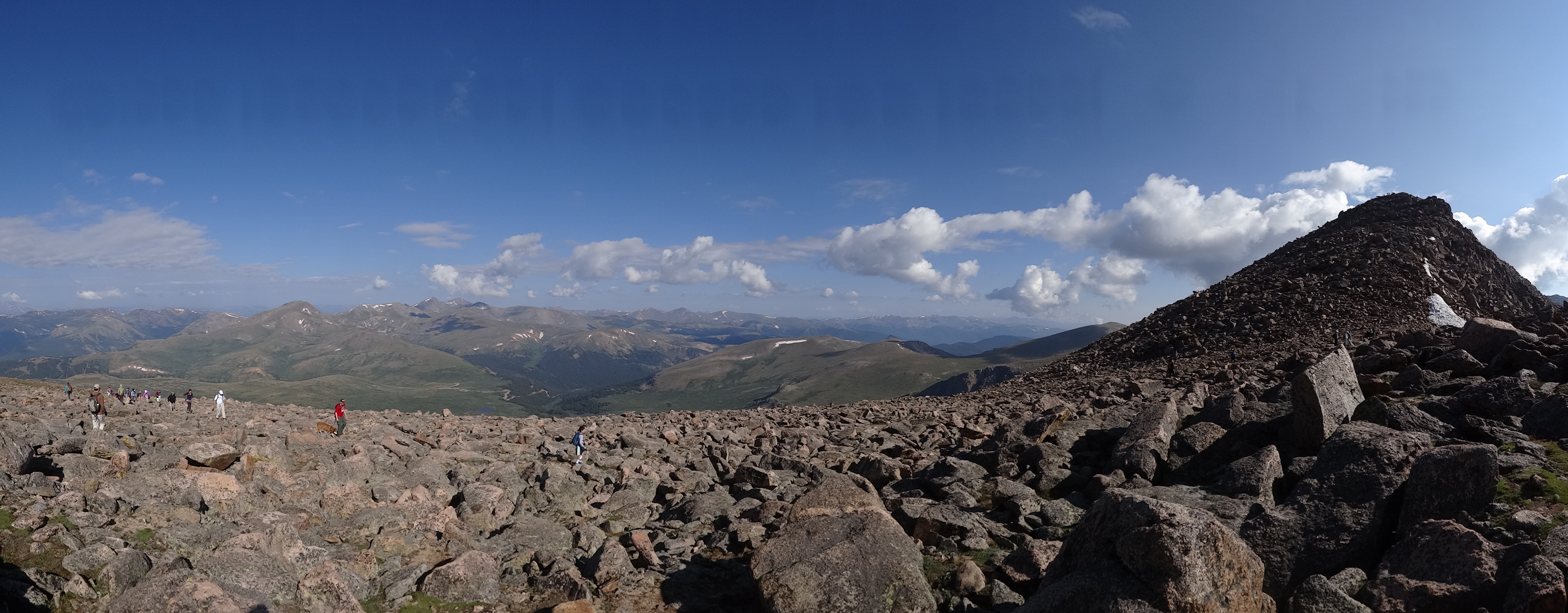 It was cold and breezy on the top of Mount Bierstadt, so we hastily took some photos and refueled with sandwiches (as a marmot eyed our food from only a few feet away).