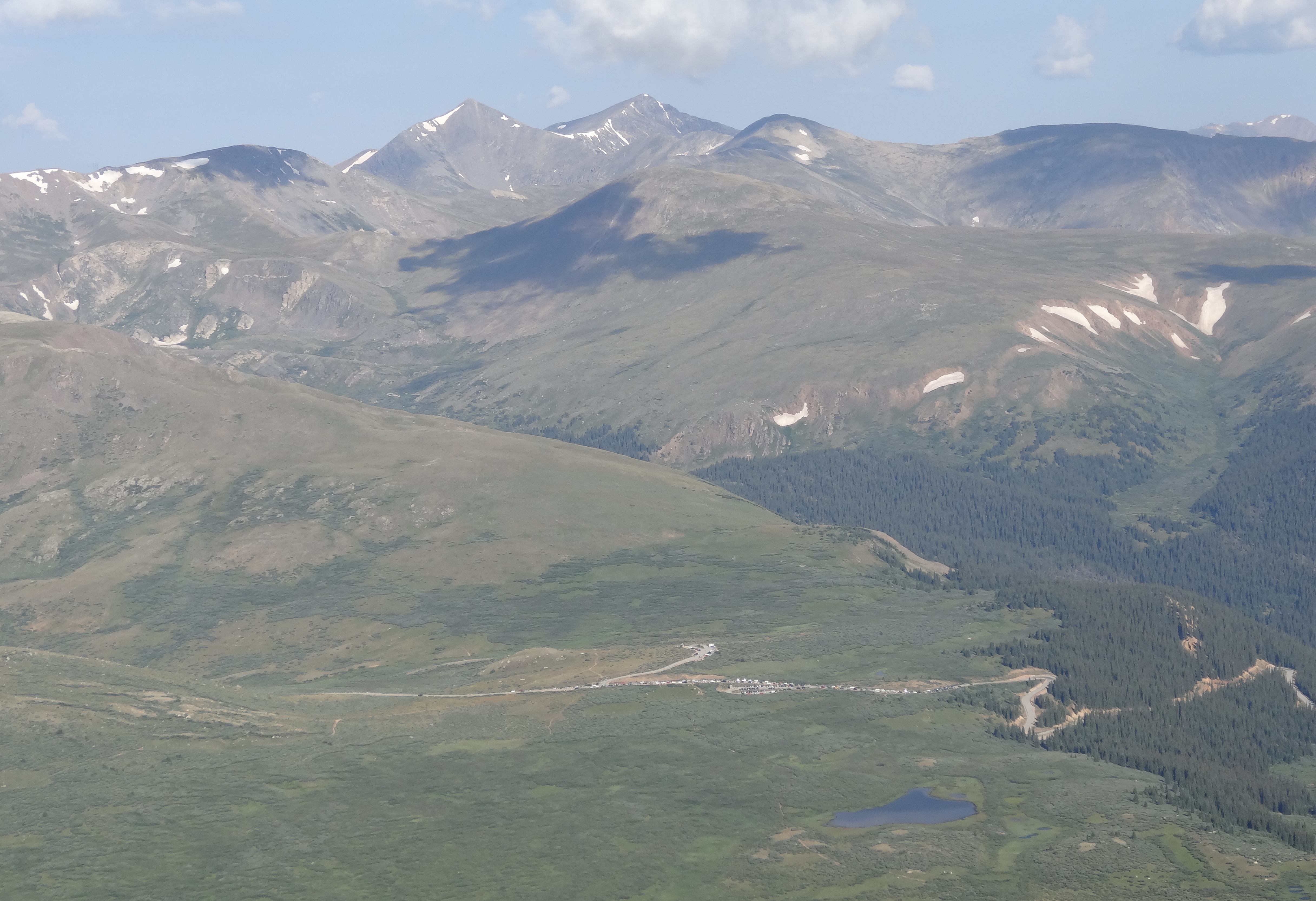 From the top of Mount Bierstadt, we could see that the tiny parking lot that earlier had only a few shiny dots in it now had shiny dots lined all the way down the road leading up to it. We knew if we lingered around any longer at the top of Mount Bierstadt, our peaceful and serene hike would be spoiled by the incoming crowds.