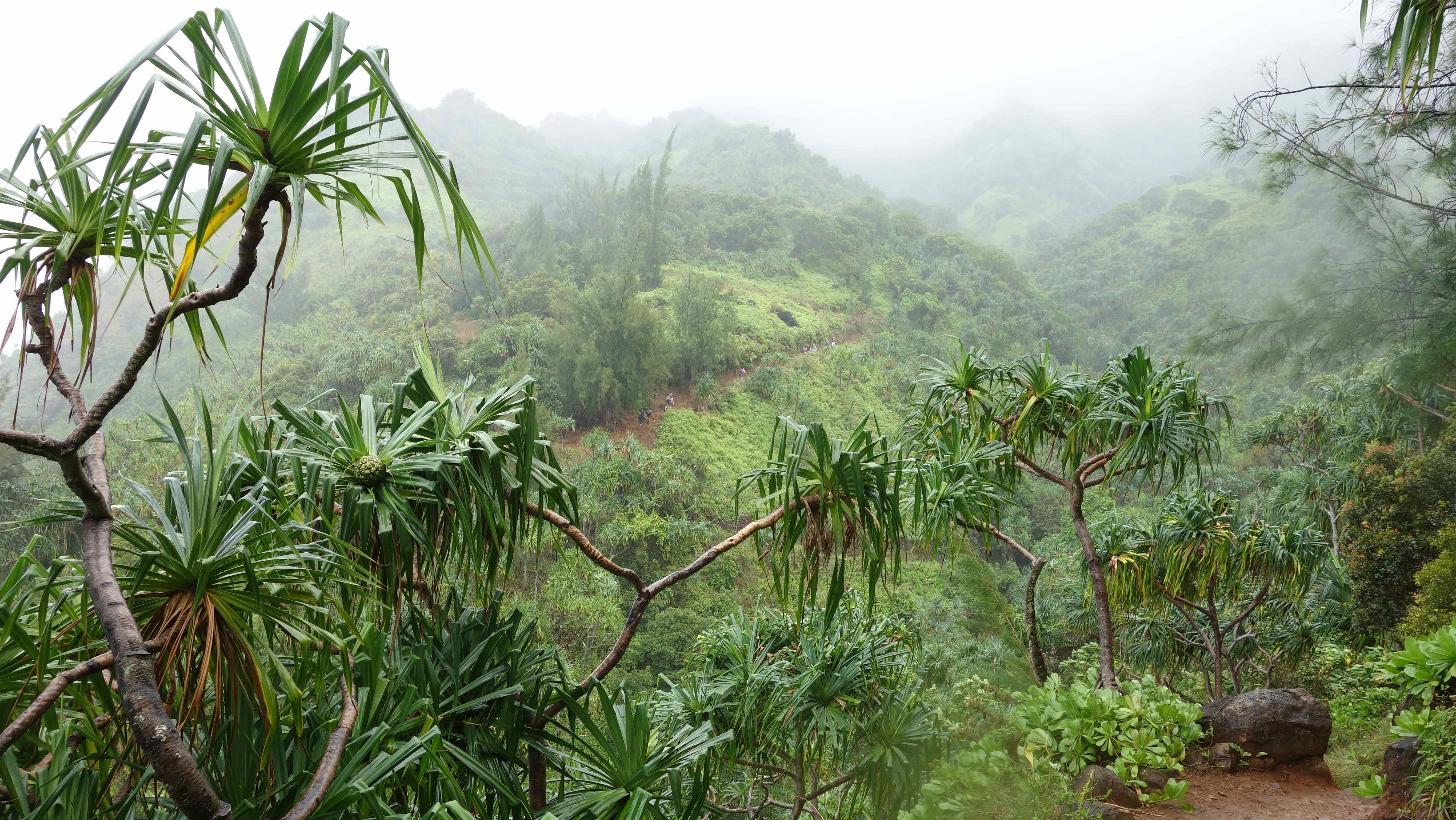 2016-02-15 26 Published February 29, 2016 at 5472 × 3080 in Kaua’i Day 4: Hiking the Na Pali Coast ← Previous Next → Fog in the Hanakapa’ia Valley. If you look closely, you can see the trail continuing on the other side.