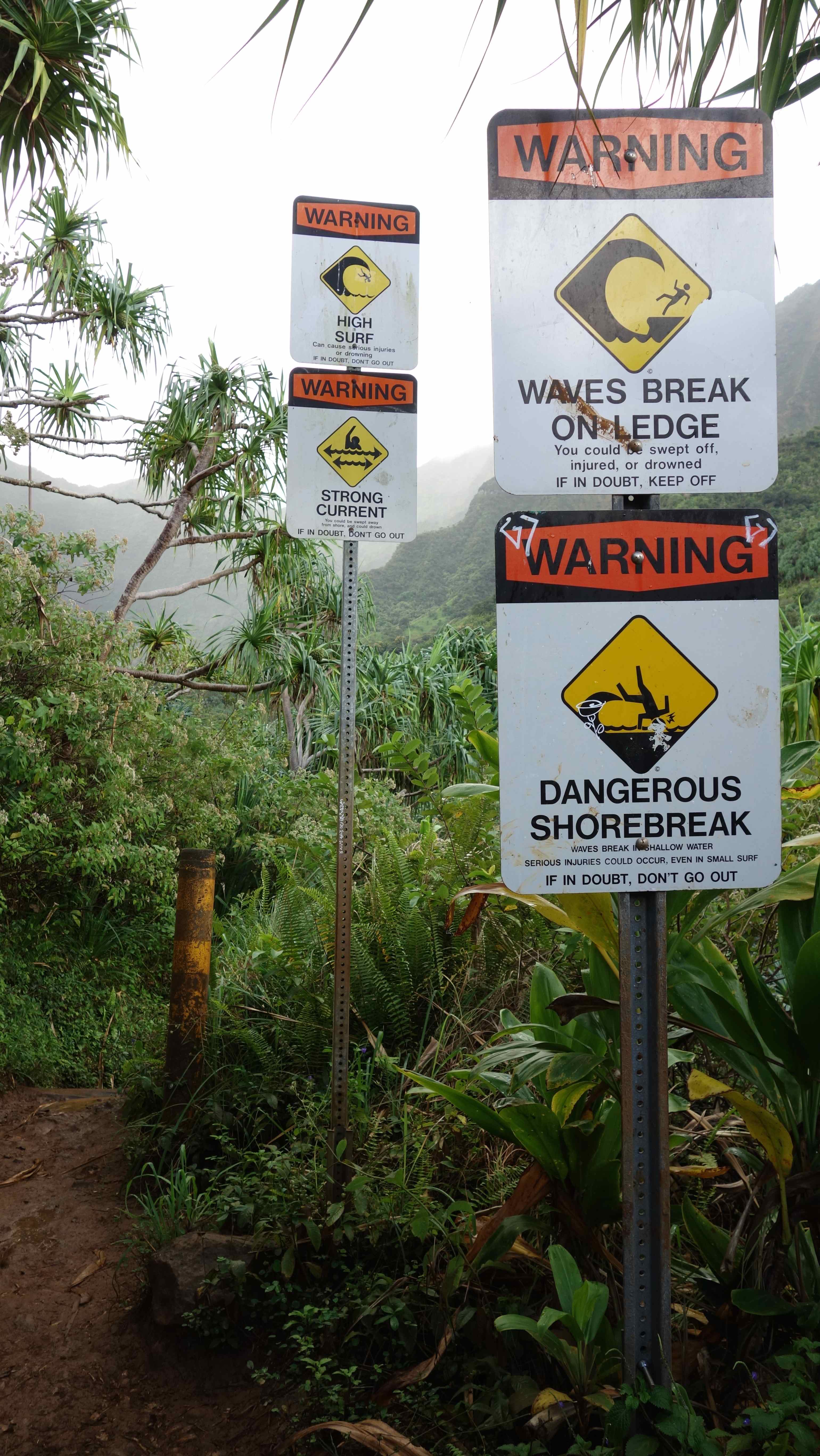 2016-02-15 9 Published February 29, 2016 at 3080 × 5472 in Kaua’i Day 4: Hiking the Na Pali Coast ← Previous Next → Many signs warning visitors not to go in the water at Hanakapi’ai Beach.