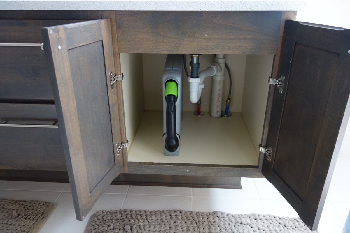 This is the “mini” central vac located in our master bathroom called a VROOM. It has a retractable hose and sucks debris into the same PVC pipes the rest of the central vac system uses. It’s so handy and I wish we had more of these mini vacs installed in other rooms!