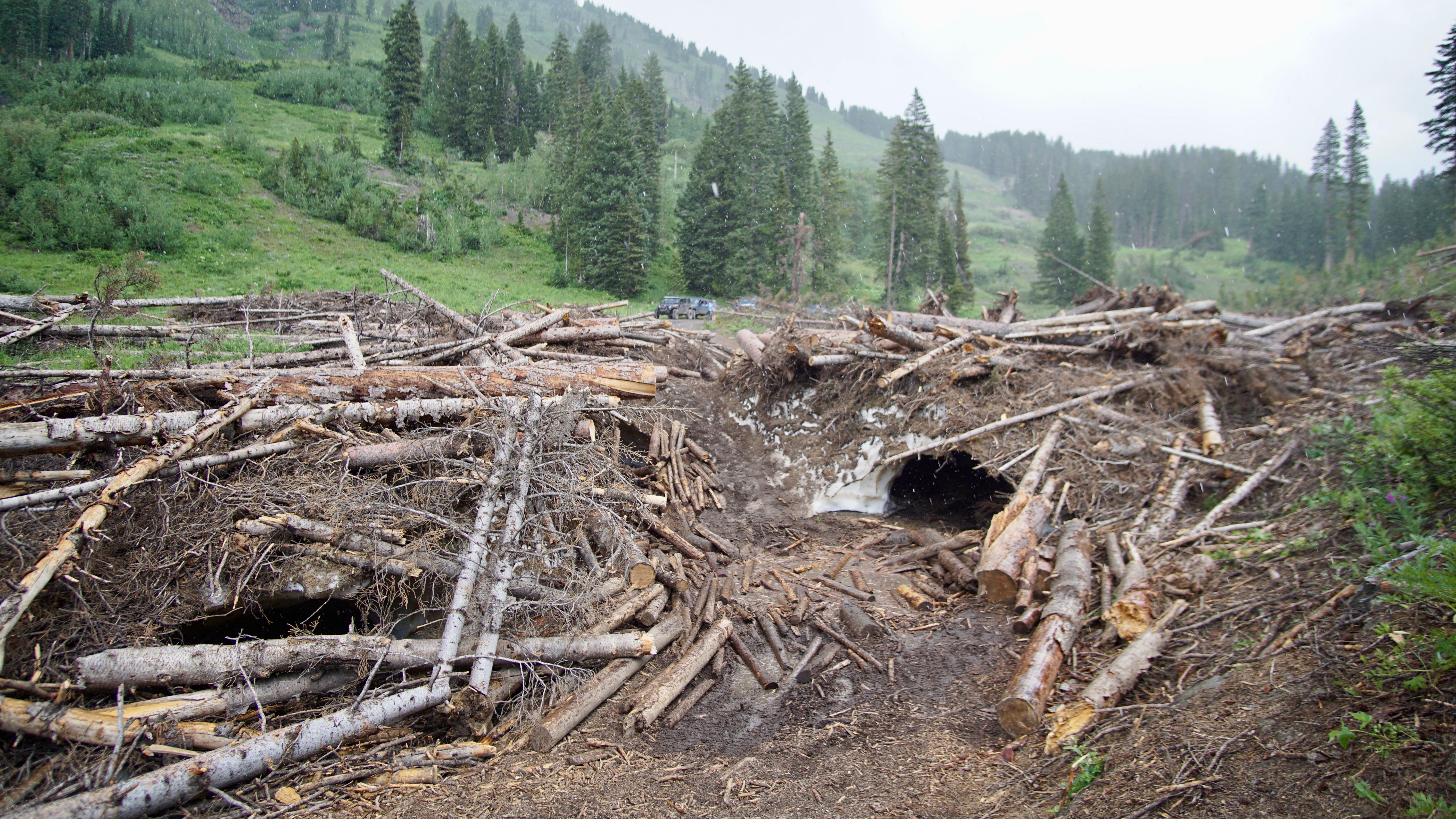 We knew there was no way we were getting past this avalanche debris that hadn’t been cleared from the 2018-2019 season, but we parked beside the road and stuck around a bit anyway to watch other vehicles tackling the impressive obstacle from the other direction. Vehicles from the other direction had the advantage of coming downhill over the debris; attempting to drive over the debris uphill (the way we were headed) was nearly impossible in our vehicle.