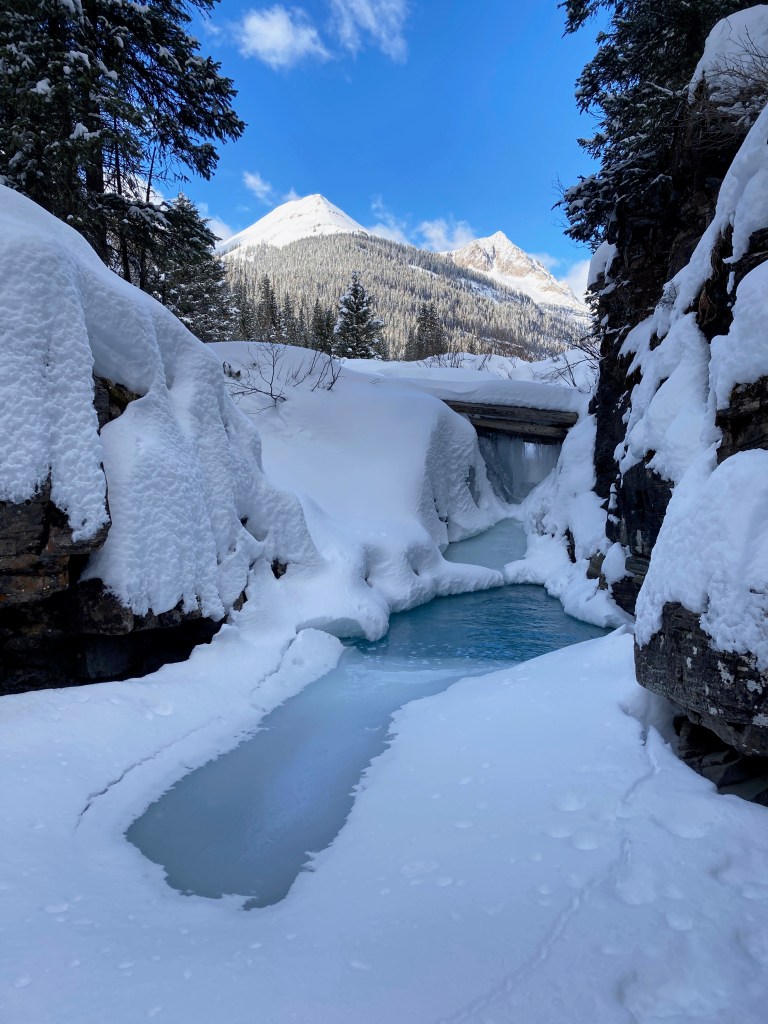 We weren’t expecting to find anything upstream and had just planned on hiking up it for fun, then turning around, but a short 10 minutes later, we stumbled upon the most magical view of a frozen waterfall underneath a log bridge, accompanied by a contrasting backdrop of bluebird skies and blinding white, snowy mountain peaks covered in snow-dusted pines.