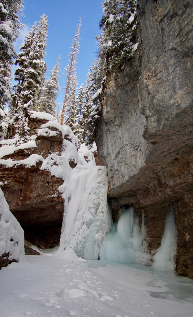 The trail to continue was upstream, but there was no way of getting past the frozen waterfall ahead that was surrounded by steep cliffs on all sides. We ended up having to backtrack downstream in order to get out and continue back up the trail.