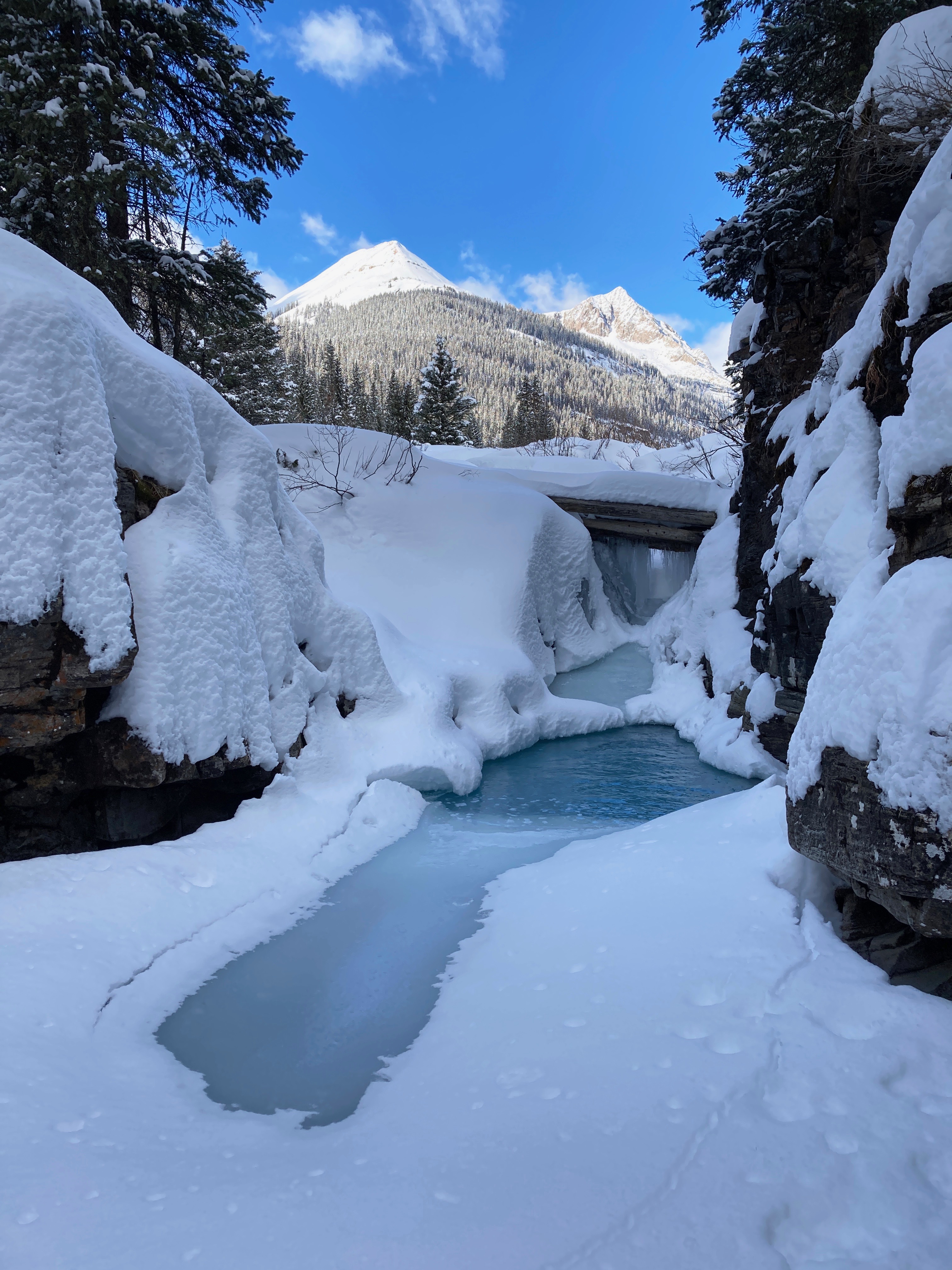 We weren’t expecting to find anything upstream and had just planned on hiking up it for fun, then turning around, but a short 10 minutes later, we stumbled upon the most magical view of a frozen waterfall underneath a log bridge, accompanied by a contrasting backdrop of bluebird skies and blinding white, snowy mountain peaks covered in snow-dusted pines.