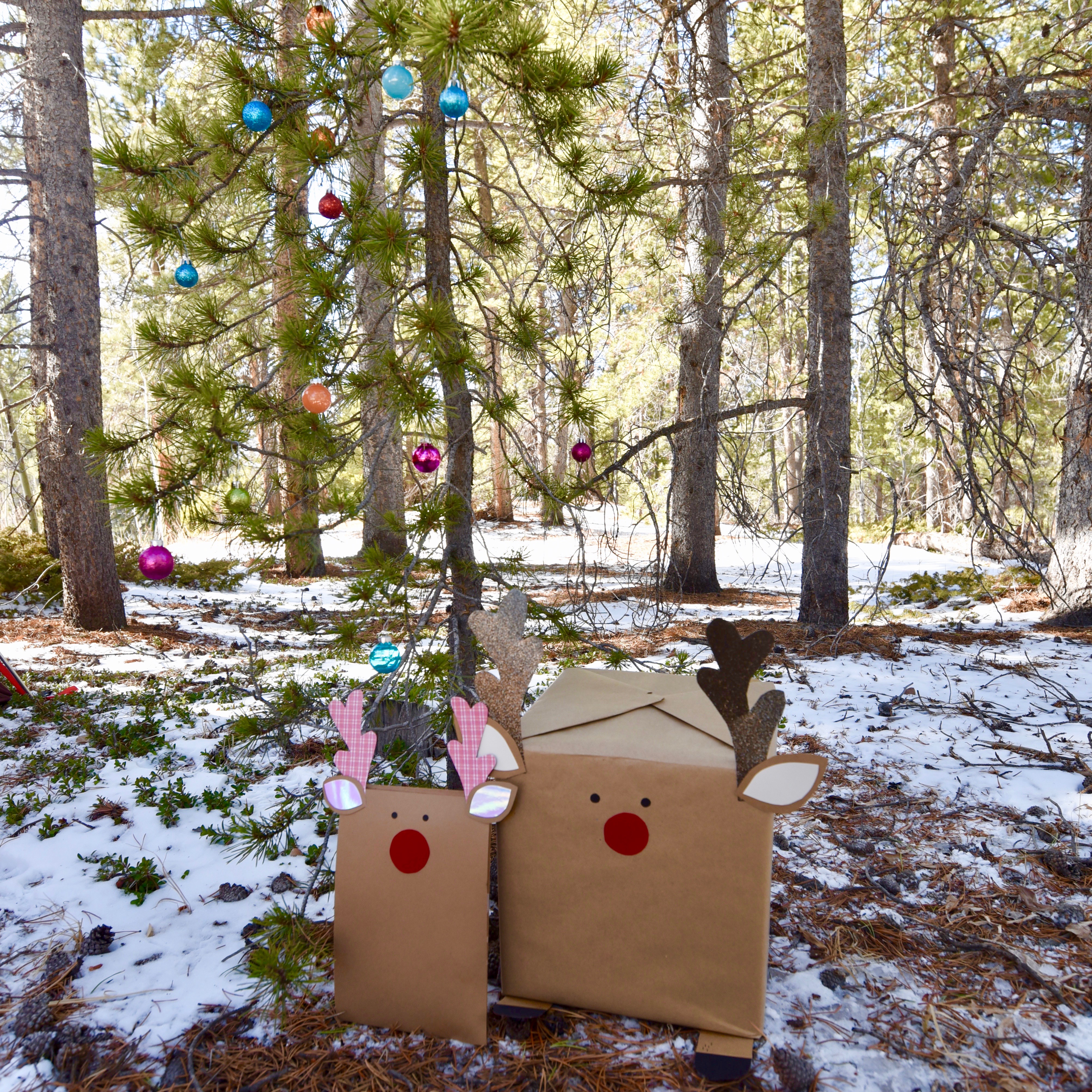 After about an hour of searching and getting turned around by trails that were too buried in snow, we eventually found a spot that would do for the night! Hubby started our handy propane fire pit right away while I decorated a Charlie Brown-esque Christmas tree, both of which would help make our holiday in the woods feel festive and cozy!