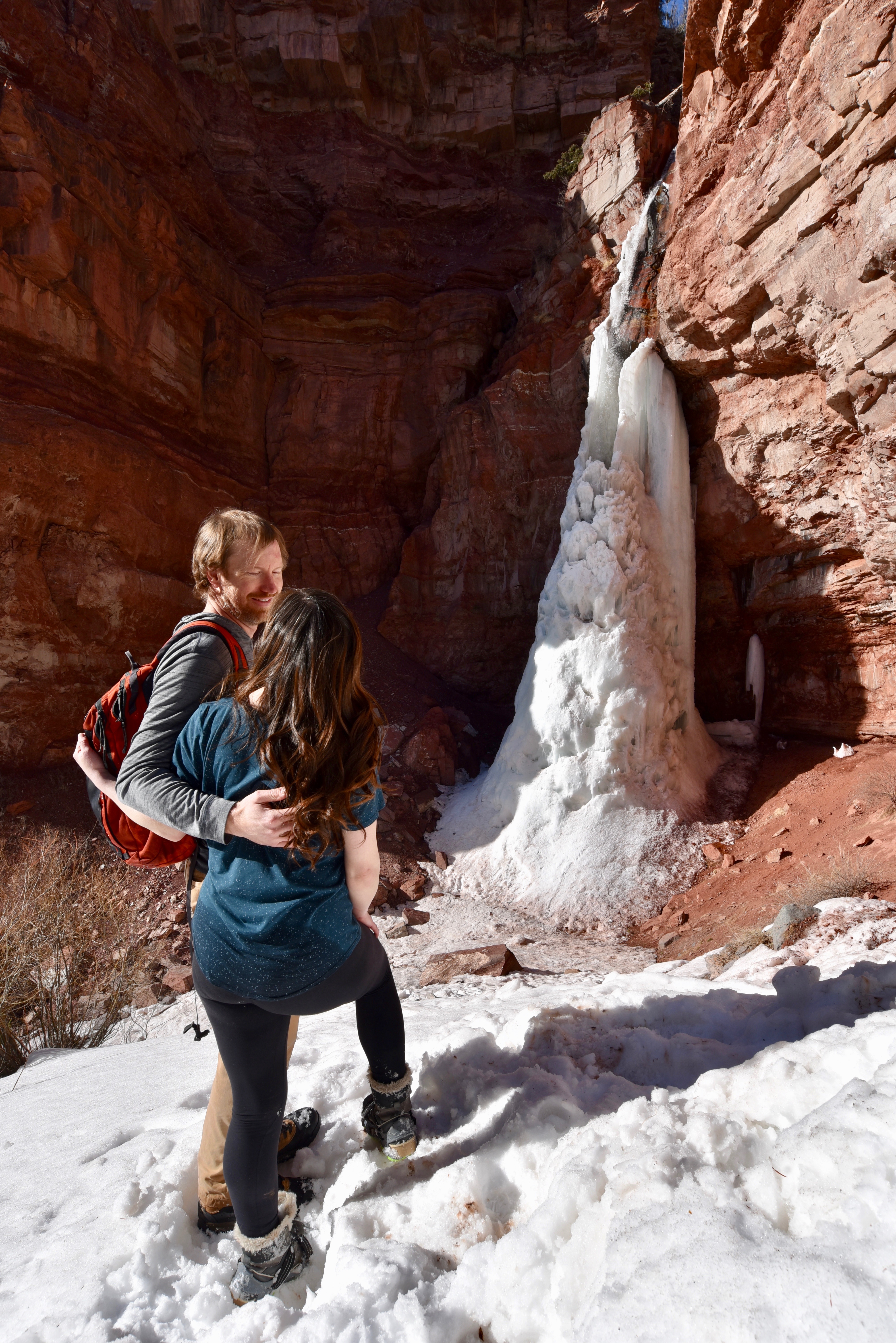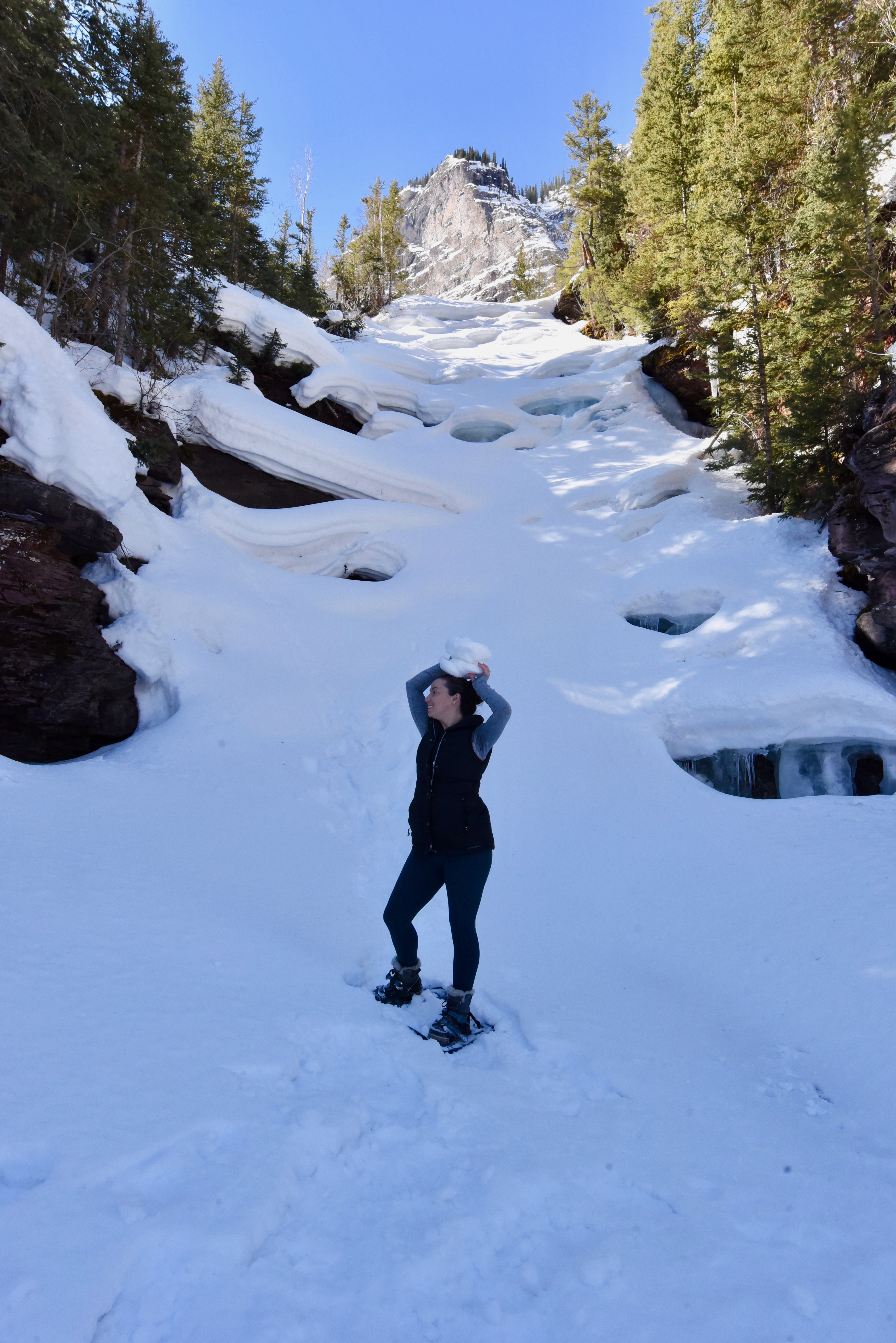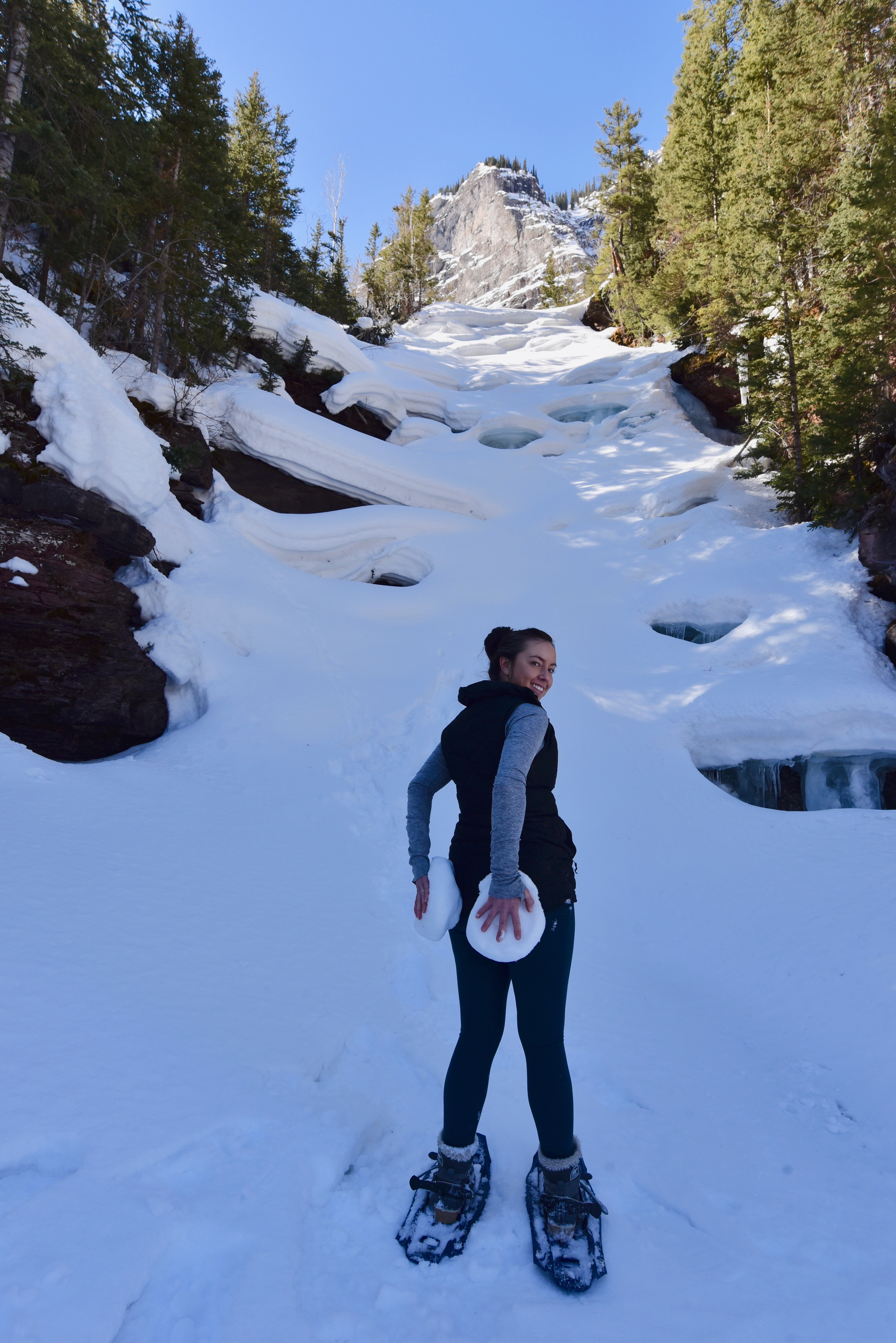 We made the best of the situation by taking some silly poses with two chunks of snow that had formed into round discs resembling that of a couple of inappropriate female body features, and onward we continued back to the vehicle, knowing that attempting to visit the second waterfall on the trail was going to be a waste of time and energy.