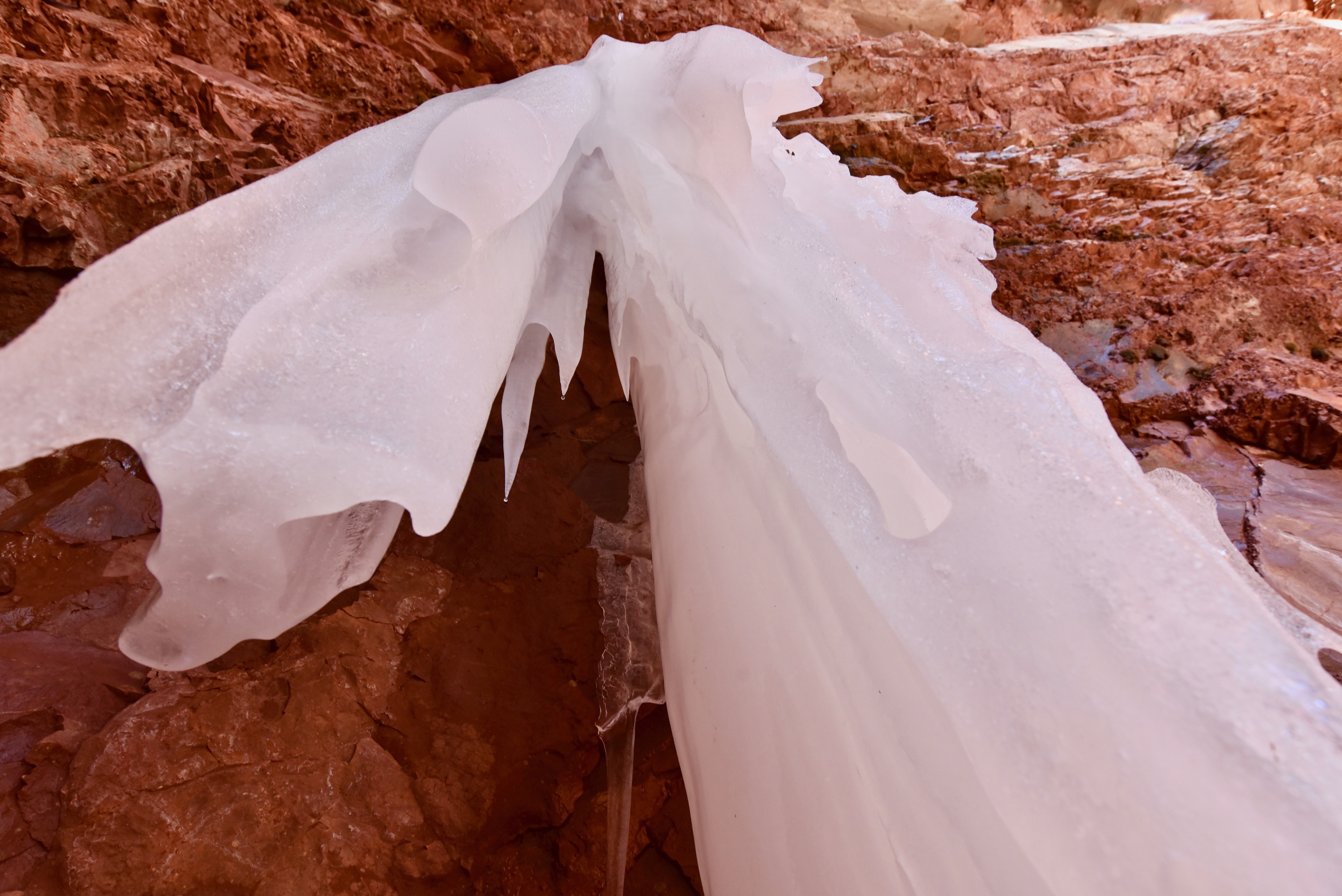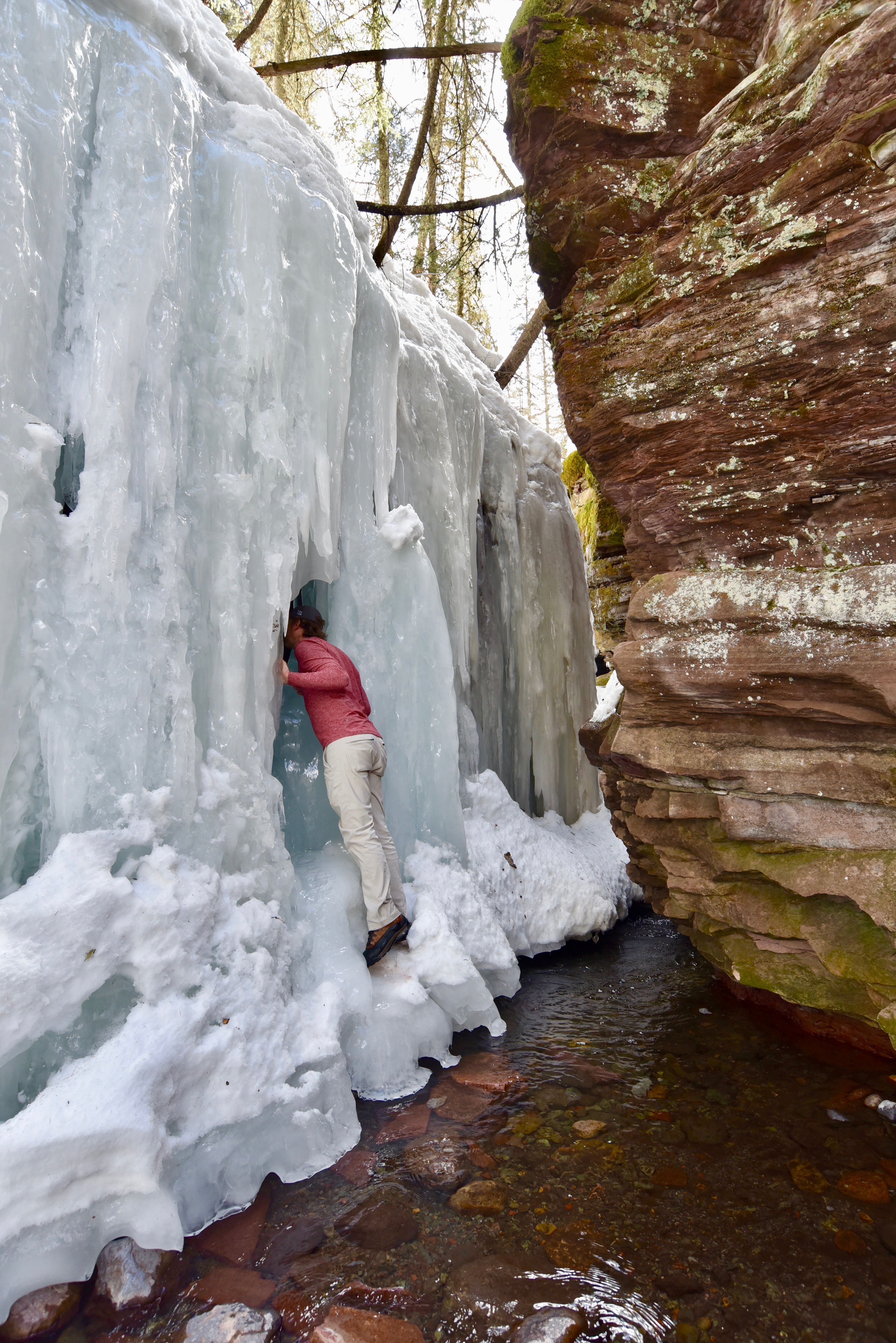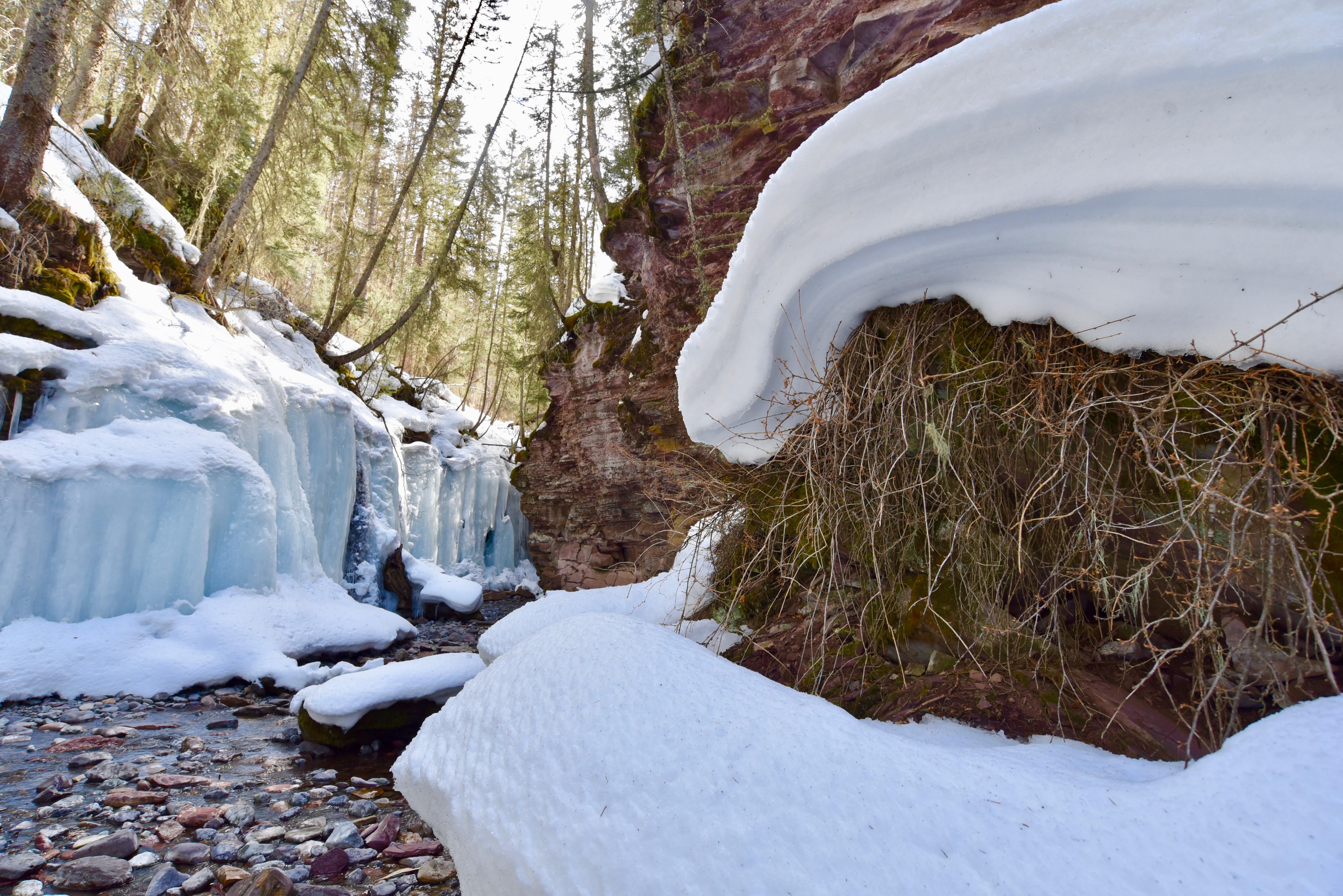 After a hilariously frustrating hike post-holing thigh-deep the ennnnnttiiiiiiiiiiiiiire way to the first waterfall in soft Spring snow, we eventually made it to our destination, only to find that the waterfall was sloped in such a way that meant it would not freeze over into a beautiful, winter spectacle, but instead appeared merely as snow clung to a cliffside.