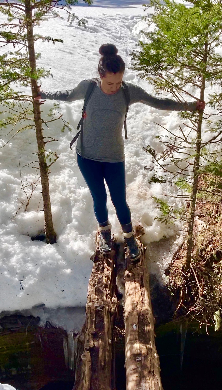 We almost didn’t make it to these magical waterfalls when a small, but slippery log bridge stood in the way between me and the rest of the trail. We easily spent 30 minutes at this “obstacle” as I debated whether possibly falling into the icy water below this thin bridge was worth the sight beyond it.