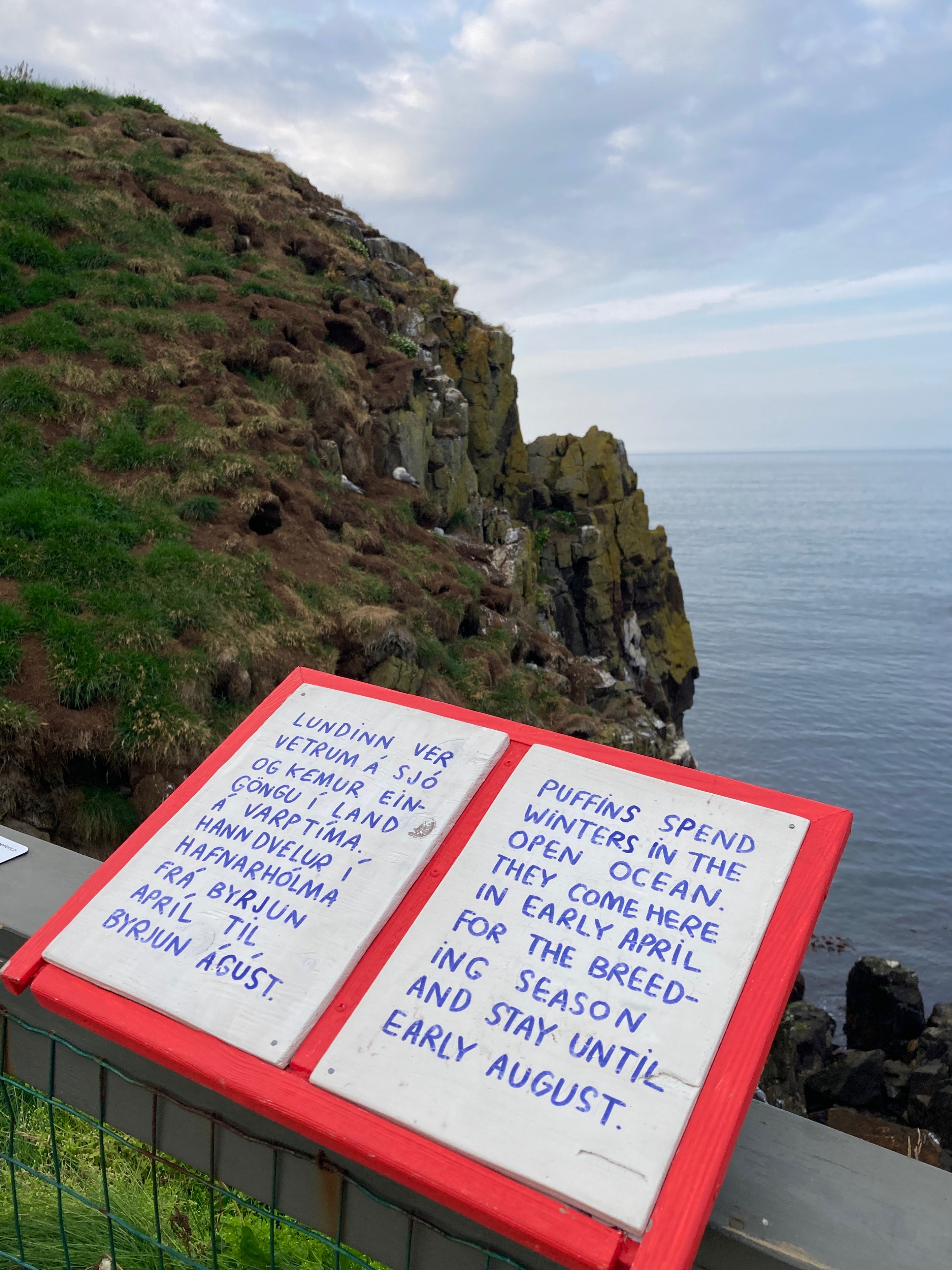 At sunset, we patiently waited at the viewing post near the harbor for nearly 45 minutes while enjoying some happy hour beverages before finally giving up. We did see a couple of puffins quickly fly in and out of their little burrowed homes on the sides of the grassy cliff, but none stuck around long enough for a decent photo. We decided we would try again in the morning!
